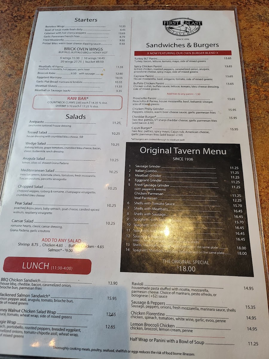 Welcome to First & Last Tavern Plainville, a charming eatery nestled at 32 Cooke St, Plainville, CT. This inviting tavern delivers a menu brimming with delicious options that cater to diverse tastes. Start your meal with a refreshing Arugula Salad dressed with zesty lemon and olive oil or indulge in the rich flavors of the Caesar Salad topped with succulent chicken.